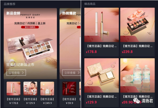 新增的品牌推荐功能,品牌则可以利用8个常规商品分类标签,更直观、清晰的对品牌产品进行展示,提升用户的“逛店”体验。完美日记在新品尝鲜功能选项中插入最近的新品链接、在热销爆款中也列出了店铺的销冠产品,这样可以使用户更清晰的浏览与挑选。