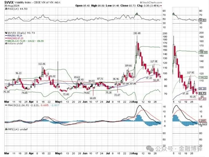 VVIX低开震荡,收阴收跌,出波段新低,下面看测试200天均线。