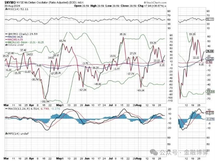 3. NYMO:NYSE McClellan Oscllator用纽NYSE的上涨家数和下跌家数来判断市场(1)计算(上涨家数-下跌家数)的19日和30日指数移动平均;(2)绘制(19日指数平均-39日移动平均)的计算结果