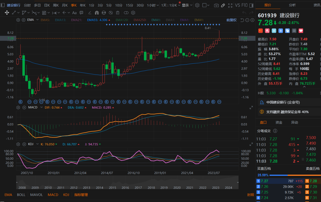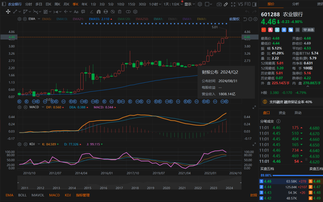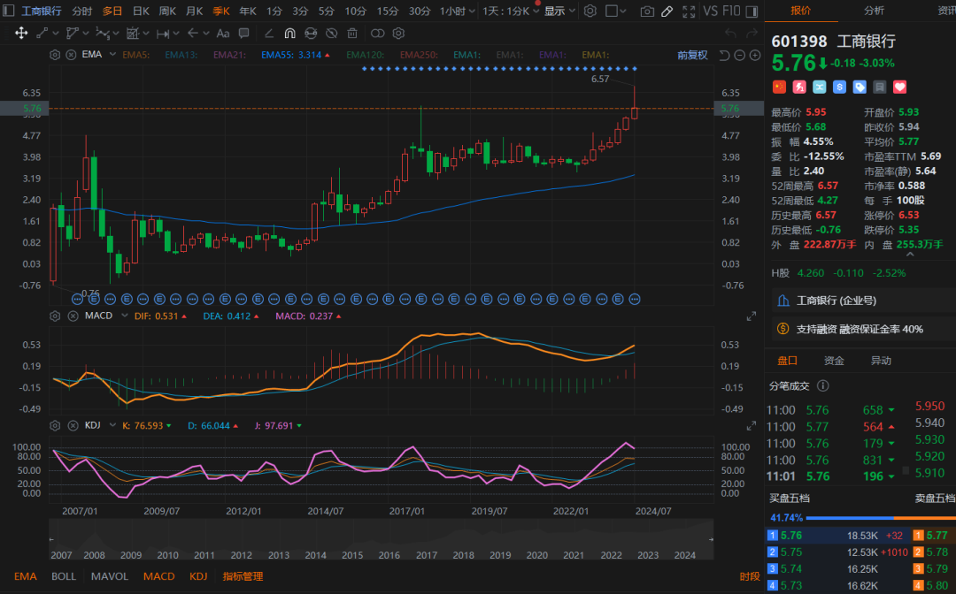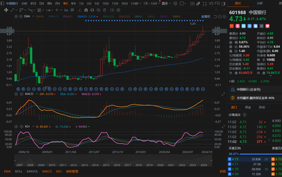 如下图所示,四大国有银行,目前的季度KDJ指标,都无一例外的出现顶部卖出信号了。