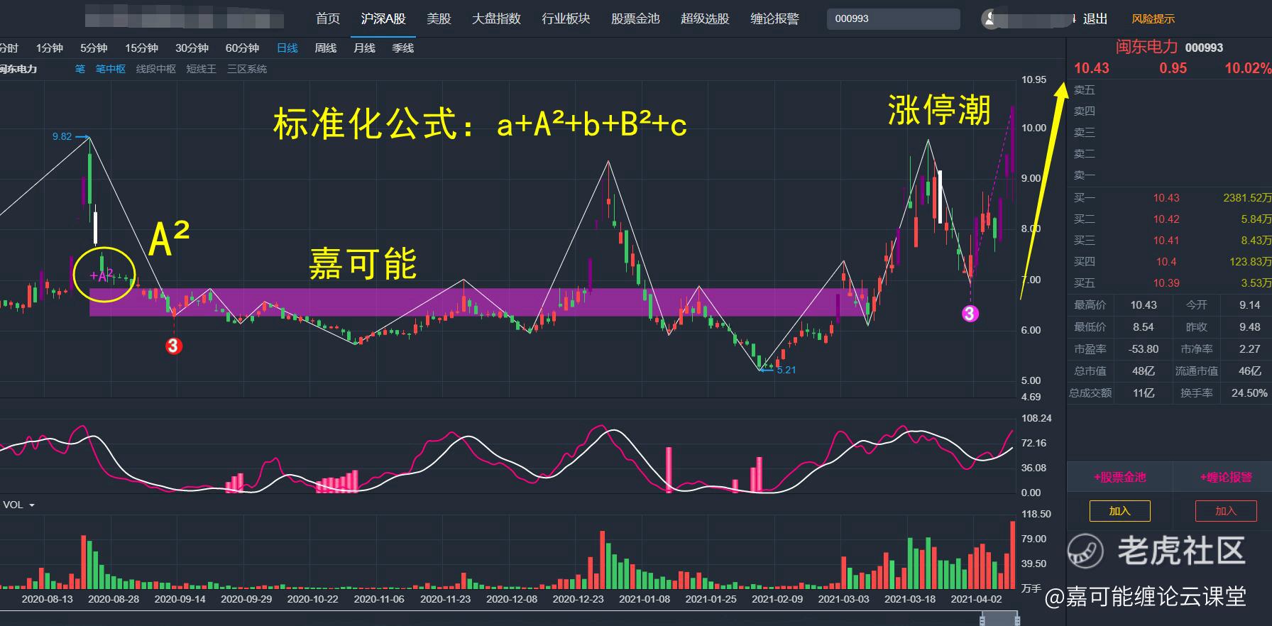 其次,就是尽可能的找中枢A²类型(紫**域),比如:今天涨停的闽东电力(000993)如下图所示: