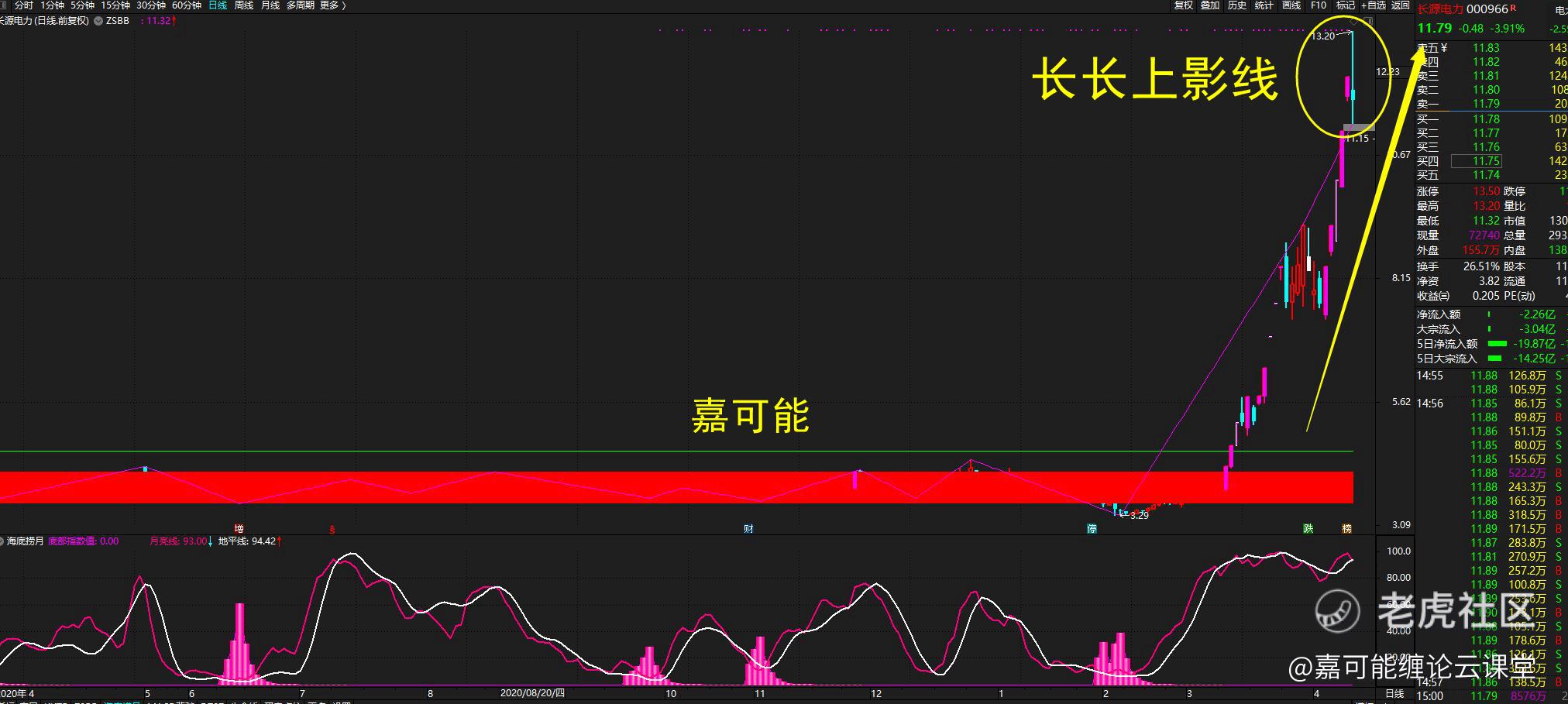 比如:碳中和概念龙头股,长源电力(000966)短期内涨幅基本,今天开始高位长长上影线了,如下图所示: