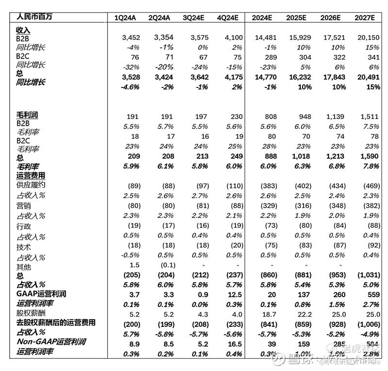 · 盈利主要得益于效率提升。运营效率的持续改善得到了几乎所有业务职能中的技术驱动增强的支持。这些包括通过数据驱动的商家竞价工具来提高采购效率,优化算法以提升供应链履行效率,以及应用人工智能提高产品匹配的准确性。111在2024年第二季度再次证明了其效率提升的成功。毛利率从2023年第二季度的6%上升到6.1%,尽管其小型B2C业务的收入减少,毛利率同比提高了220个基点,达到24%。这一毛利率与该细分市场中更大的成熟企业相当甚至更高。与此同时,总运营费用占净收入的6%,较去年同期减少了120个基点,若排除基于股票的薪酬,则改善了70个基点。各项费用项目的比率均有所改善。