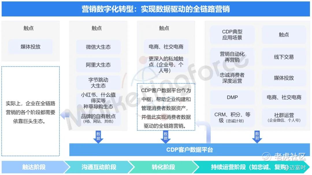 在这其中,客户数据平台(CDP)是关键产品,它整合全渠道数据,识别客户身份,创建统一ID,提供全面洞察客户的能力,通过数据赋能,实现全域生态营销。它解决了不同平台ID身份不一致的问题,形成统一的用户视图。基于CDP的数据中台能力,进而可以赋能企业客户资产沉淀、个性化精准营销、广告投放、销售运营赋能和客户信息共享。