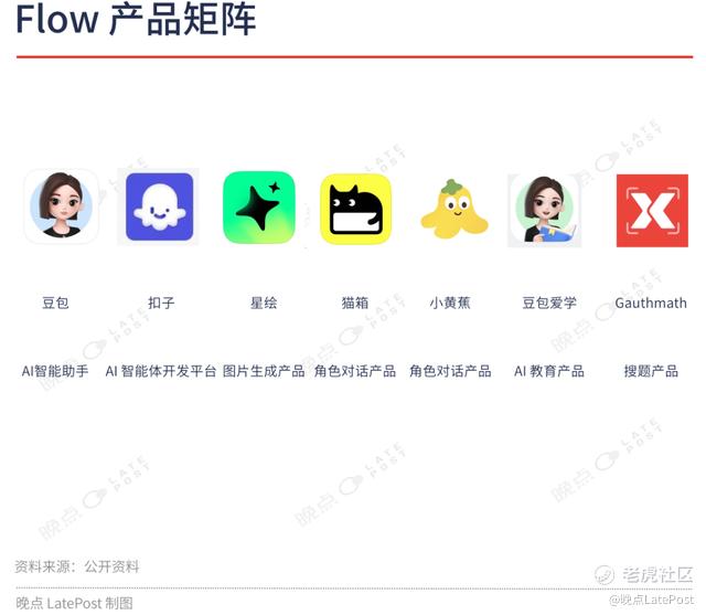AI 硬件之外,Flow 旗下现有 AI 智能助手豆包(APP 版和 PC 版)、AI 智能体开发平台扣子(中国版)和 Coze(海外版)、图片生成产品星绘、类 Character.AI 的角色对话产品猫箱(原叫话炉)和小黄蕉、AI 教育产品豆包爱学(原河马爱学)、出海搜题产品 Gauthmath 等数款 AI 软件和互联网应用。