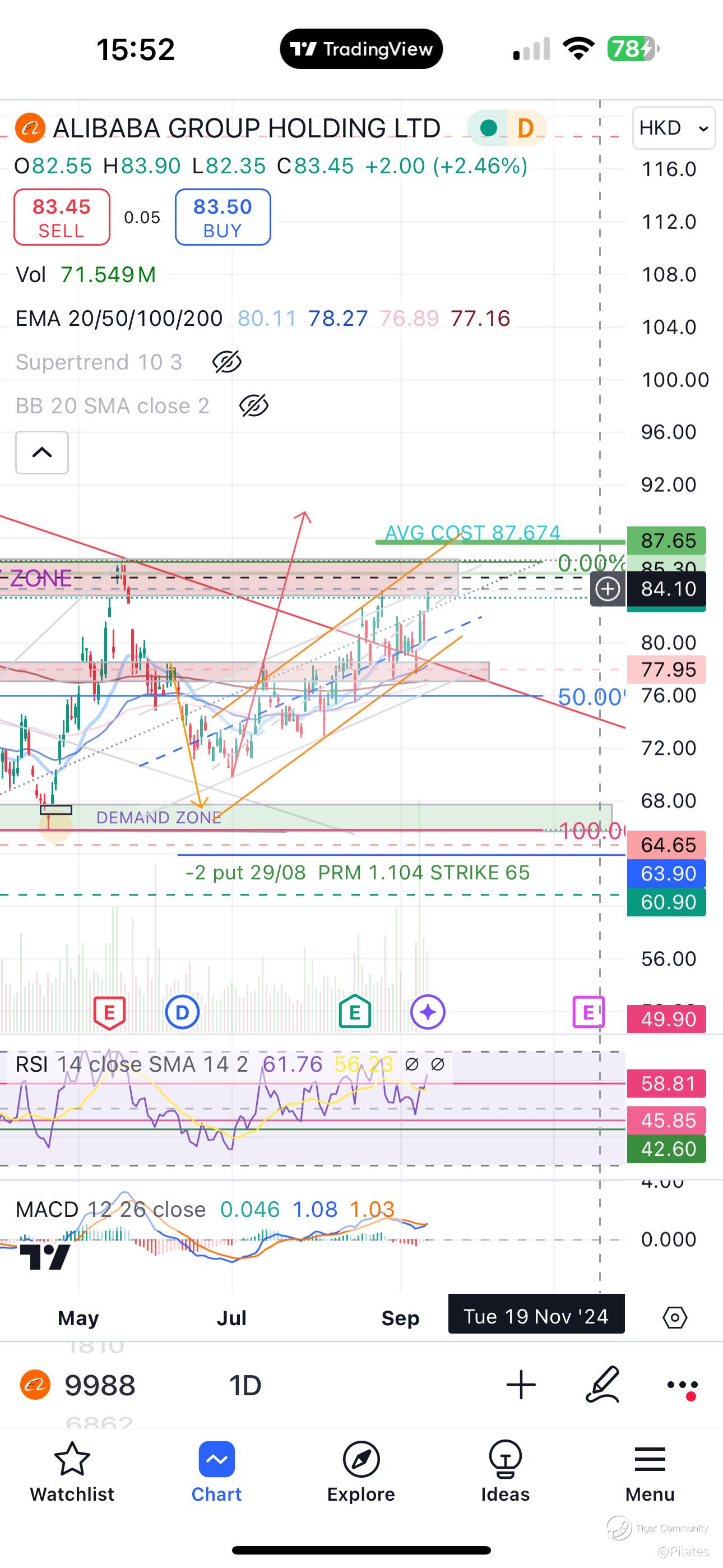 $BABA-W(09988)$ Again disregarding news. Price seems to be aiming for $85-$86 level. EMA, RSI, MacD exhibiting bullish momentum. Resistance to break is upper channel of BB and last high of $86.90. A healthy pullback while holding its current bullish support may just be the turning point. Monitoring price action and sell CC if opportunity strikes 🙌🏻🙌🏻trade safe Everyone!
