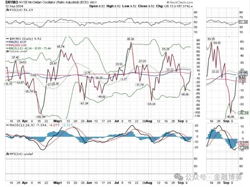 NYMO果然续涨,回上正值区,RSI上50。明天再涨,则三个指标全部转牛。