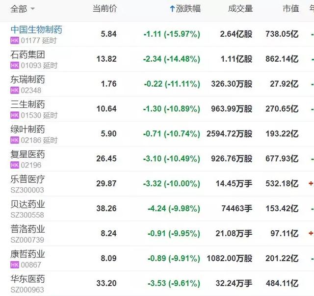 中标药品降价大幅超出市场预期,受此消息影响,A股医药板块在近日出现连续大跌,多股出现较大波动,甚至港股市场也不能幸免,中国生物制药在昨日大跌15.97%后,今日继续下跌7%,复星医药、石药集团等同样如此。