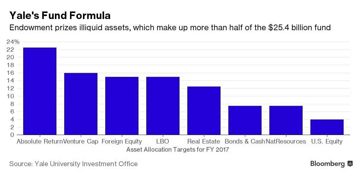 耶鲁的分类有些不同,不过他的对冲基金比率非常高,达到22.5%,接下来是风投16%,外国证券15%,LBO私募15%,房地产12.5%,债券和自然资源各7.5%左右,美国证券4%。