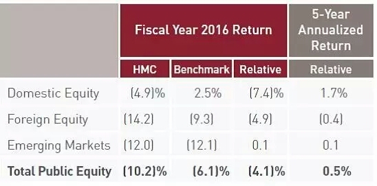 哈佛2016年度的收益率是-2.0%,在他的报告中声称主要是因为投资南美能源股的缘故。我们之后来按他的各资产类别收益分析一下。