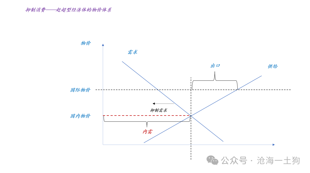 上图提炼了赶超型战略的最核心法宝——国内物价显著低于国际物价,这并不是自然发生的,它需要国内收束自身内需(ps:勒紧裤腰带),让很多生产转化为投资和出口。