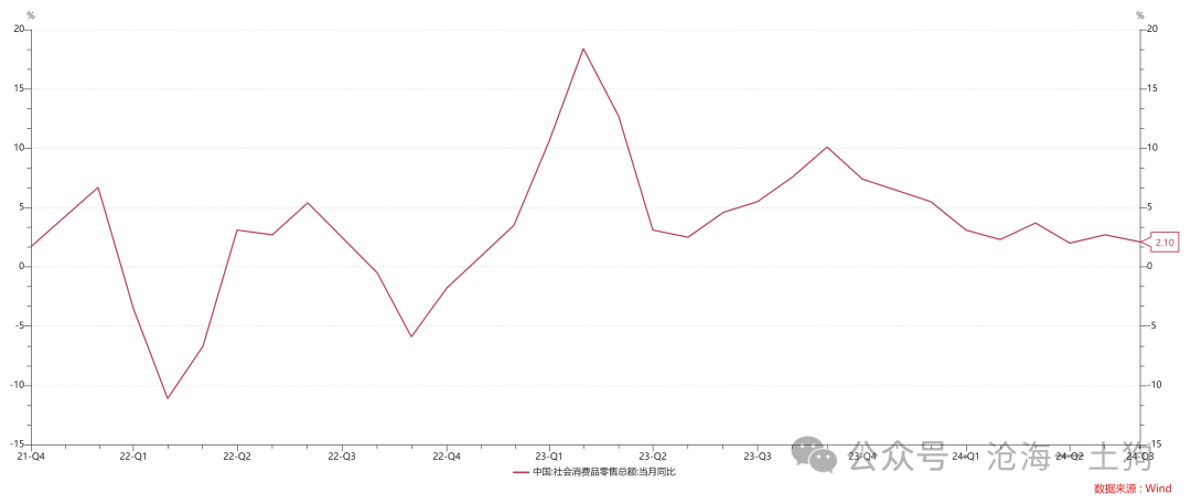 如上图所示,8月份的消费数据已经落地,增速继续放缓,中国8月社会消费品零售总额同比 2.1%,预期2.50%,前值2.70%。