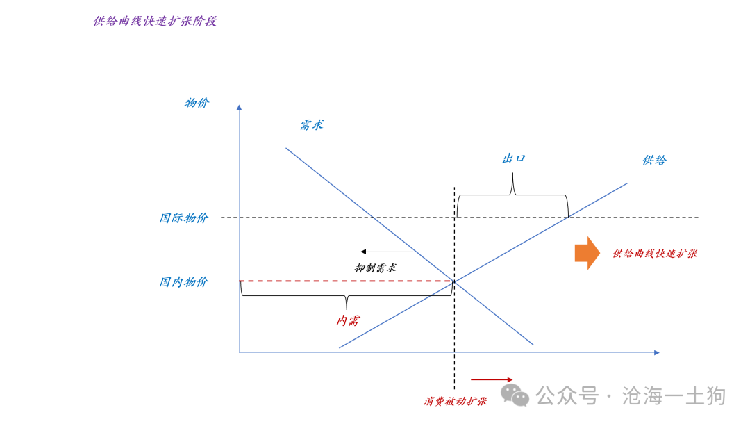 如上图所示,在这个阶段,由于全要素生产率较高,供给曲线快速扩张,虽然国内的物价水平还是低于国际,但是,消费也会被动扩张。