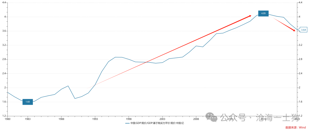 如上图所示,之所以我们在2018年之前体感尚可,是因为购买力平价的人民币汇率一直在贬值,从2贬值到4左右,这意味着国内的物价水平在向国际物价水平靠拢。但是,在2018年之后,情况发生了变化,购买力平价的汇率从4左右升值到了3.6附近,这意味该段时间国内的物价水平和国际物价水平出现了乖离。