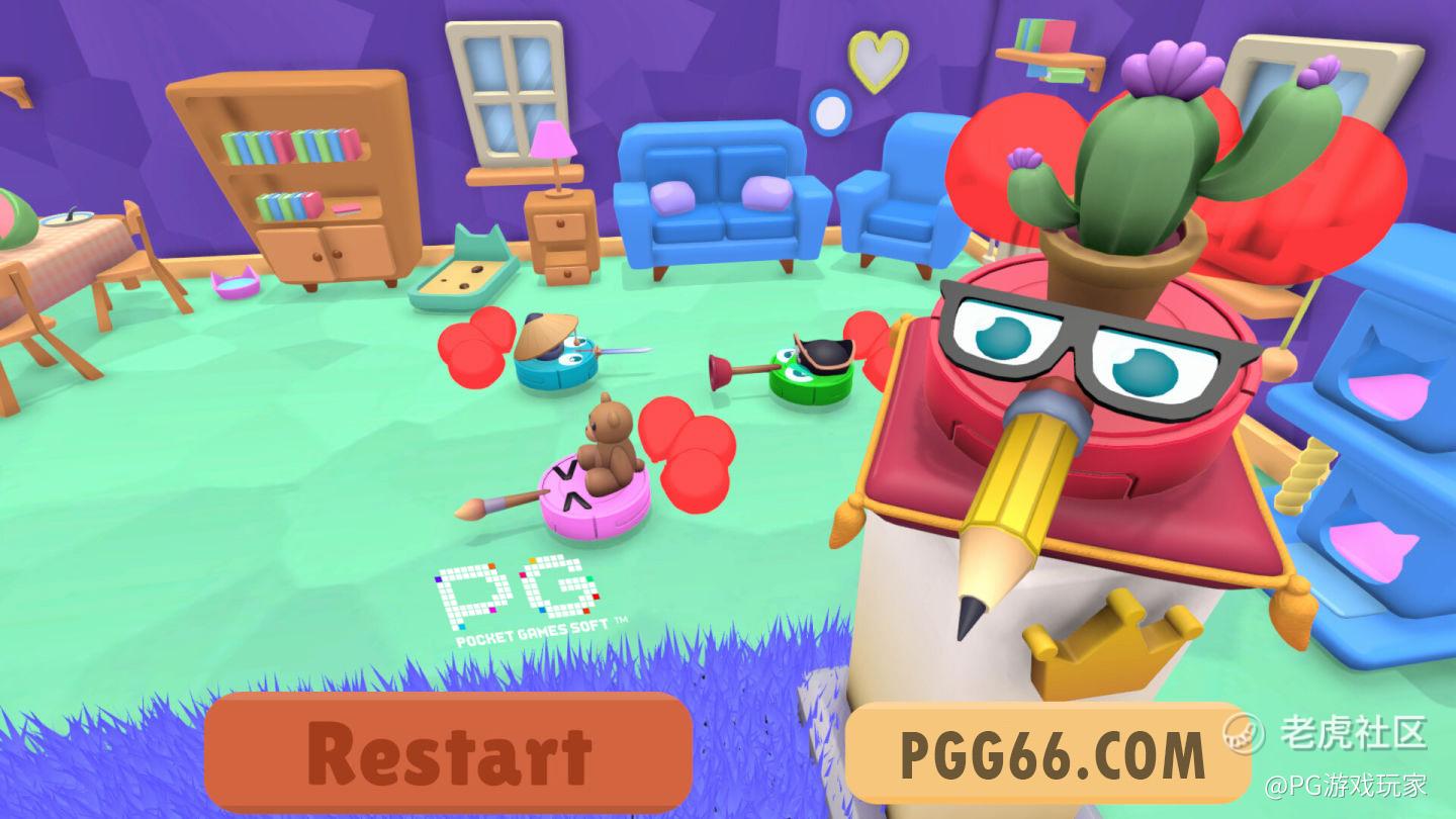 在PG游戏《RoomBattle》中,玩家们可以在各种场景里对战,比如客厅和办公室,利用吸尘器前面的武器(铅笔、剑等)来攻击对手。每个吸尘器的后面还有三个气球,谁的气球先被戳破,谁就得被淘汰!而且每回合结束时,留着气球的玩家将被称为最后的赢家。要是回合快结束,场地里还会出现一个闪闪发光的圆圈,气球在圈外也会瞬间破掉,真是太刺激了!