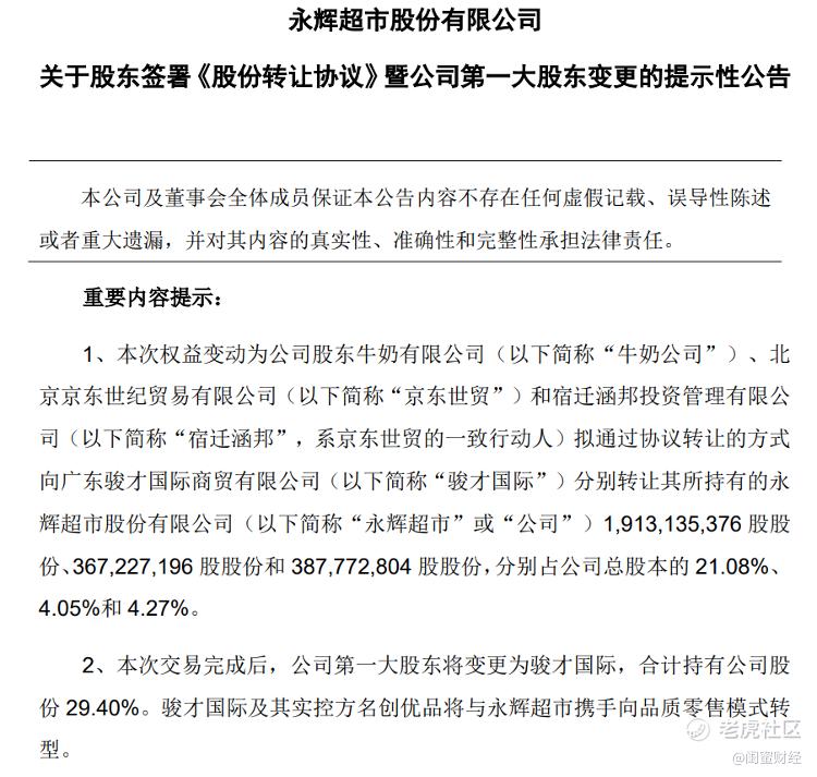 此次公告的股份转让,分别涉及永辉超市的大股东牛奶公司(香港怡和集团旗下)、以及第三大股东京东世贸和宿迁涵邦(均为京东系)。三者分别转让所持永辉的19.13亿股股份、3.67亿股股份和3.87亿股股份,分别占该司总股本的21.08%、4.05%和4.27%。