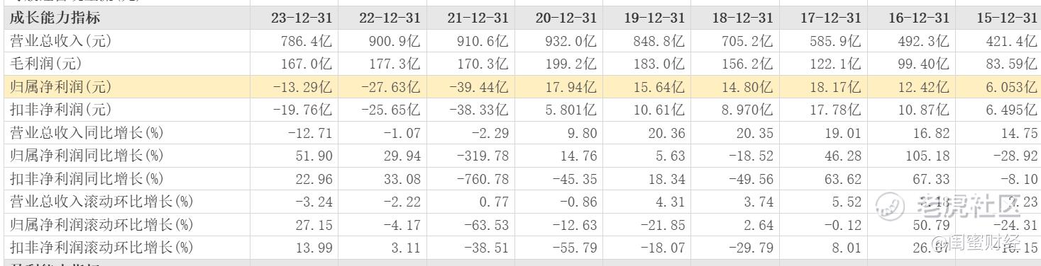 2023年更难了。营收同比降幅扩大到12.71%。786.4亿元的营收退回到2019年之前的水平。归属净利润依然为亏损状态:-19.76亿元,不过亏损额度相比2023年有所缩窄。