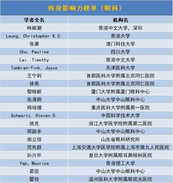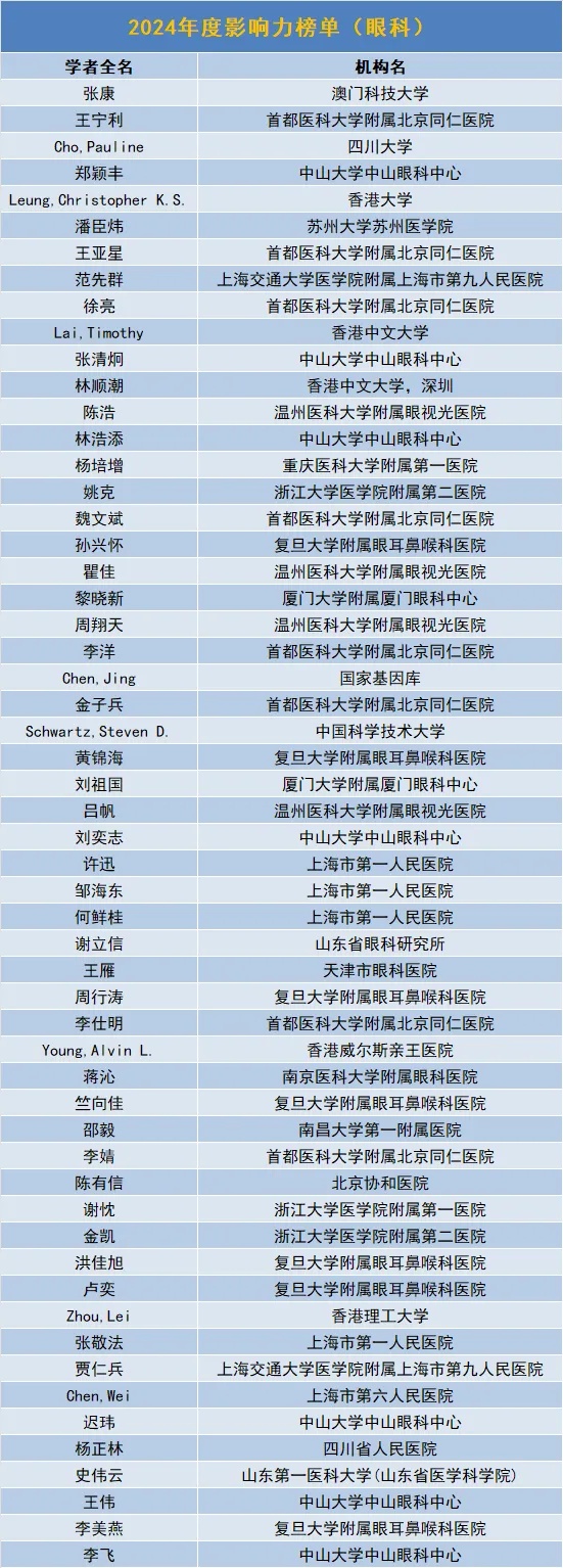 在“眼科学与眼视光学(Ophthalmology and Optometry)”领域,中国共有20名眼科学者入选终身影响力榜单,并有56名眼科学者入选2024年度影响力榜单。入选全球前2%顶尖科学家榜单,意味着该学者在其研究领域具有较高的世界影响力,为该领域的发展作出了杰出贡献。