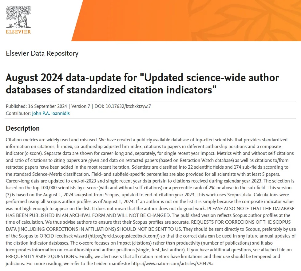 近日,美国斯坦福大学和爱思唯尔数据库发布了《2024年度全球前2%顶尖科学家榜单(World's Top 2% Scientists 2024)》。该榜单基于Scopus数据库的引用数据系统分析,以被引数、H指数、HM因子等6种综合指标,根据“终身影响力(career)”和“年度影响力(single year)”,从近700 万名科学家中遴选出世界排名前2%的科学家。