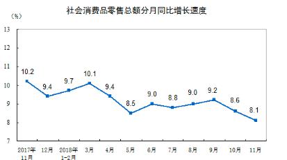 从名义增长看,11月份社会消费品零售总额当月同比增速比上月回落0.5个百分点,主要是受汽车类商品降幅扩大和石油类商品增速高位回落等因素影响。11月份,限额以上单位汽车类商品同比下降10%,降幅比上月扩大3.6个百分点;石油类商品增长8.5%,增速回落8.6个百分点。据测算,此两类商品拉低社会消费品零售总额增速超过0.7个百分点。从实际增长看,扣除物价因素,11月份社会消费品零售总额实际增速比上月加快0.2个百分点。