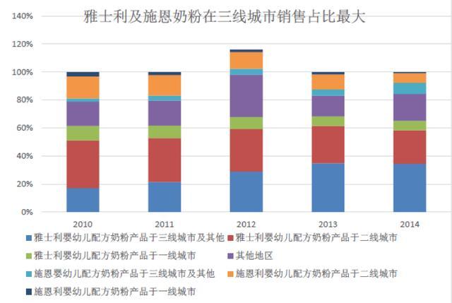除了出售事项带来的利好,雅士利还有政策带来的利好。奶粉行业《婴幼儿奶粉配方注册制度》已于2018年年1月1日起正式施行,预计新政的施行会肃清70%以上的婴幼儿奶粉品牌,将空出20%-25%的市场规模,预计份额为160-200多亿元。被挤出市场的奶粉大部分是贴牌奶粉,主要集中在三四线城市及乡镇。而从下图可看出国产品牌主要集中在三四线城市及以下,进口奶粉则占据一二线城市,由此国产品牌企业将能从中获益。而雅士利作为国产龙头企业,销售主要主力在三线城市及以下,将能从空出的市场规模中分出一杯羹。