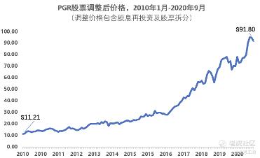 前进保险是成立于1927年的美国车险公司。在公司创立之初,其经营范围主要是针对蓝领工人的车险业务以及汽车租赁公司的财产险业务,这家公司凭借着持续不断的创新能力,在车险业务上进行深耕,过去近百年的时间,使得旗下车险业务在发展中逐渐壮大。根据美国SNL Financial数据显示,2019年前进保险在个人车险业务的市场份额位列第三名,其保费规模已经达到了超过300亿美元,同时公司市值也超过了550亿美元,过去十年为股东创造了接近8.2倍的回报。