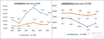 State Farm与前进保险综合费用、承保利润率对比,2015年-2019年 数据来源:State Farm与前进保险公司年报(2015-2019)