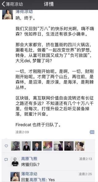 12月15日,早期数字货币投资者,国内比特币社区早期建设者之一,Mixin COO薄荷朋友圈发文指出:"Firedcat(烤猫)也终于归队了。"