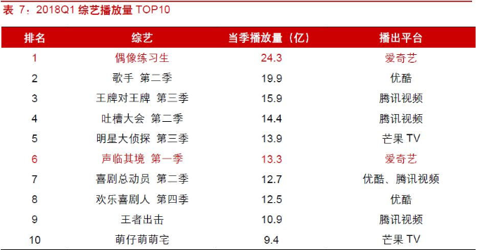 综艺方面,2018年上半年,爱奇艺推出多部创新的自制综艺,播放量及口碑表现亮眼,一季度,爱奇艺自制综艺数量占比25%,但流量占比48%。其中《偶像练习生》播放量24.3亿,为 2018Q1综艺播放量排行榜第一名,且播放量大幅超越其他节目。
