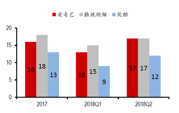 对比其他两大在线视频平台腾讯及优酷,爱奇艺在2017-2018第二季度TOP20头部剧数量分别为16、13和17部,头部剧数量在三大视频平台中与腾讯视频相近,在2018年第二季度时已经达到腾讯一致,显著高于优酷。