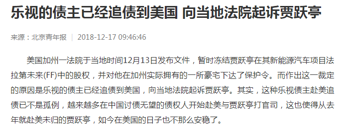 而大股东贾跃亭已处于泥菩萨过河自身难保,12月13日,乐视的债主已经追债到美国,向当地法院起诉贾跃亭,法院冻结贾跃亭在其新能源汽车项目法拉第未来(FF)中的股权,并对他在加州实际拥有的一所豪宅下达了保护令。