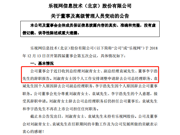除此经营业绩大幅下降和亏损之外,公司管理层频繁变更,2016年至今,“乐视系”已有至少42位高管离职,其中大多数都是乐视曾经花重金挖来的。而刚不久的12 月 13 日,乐视网总经理刘淑青、副总经理袁斌、董事李宇浩纷纷辞职。