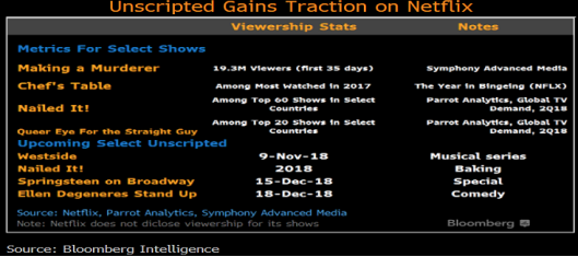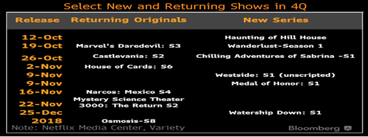 在2018年第四季度,不断更新的连续剧使得奈飞的订阅者不断上升。公司预计在全球范围内今年将增加940万订阅量,较全年相比,增速上涨了13%。其中最受到观众期待的《萨布丽娜的惊心冒险》在10月26日上映,第三季的《超胆侠》和最后一季《纸牌屋》将在11月2日上映,这些在观众口碑中较好的奈飞独家电视剧将持续的给奈飞带来大量的流量和订阅者。
