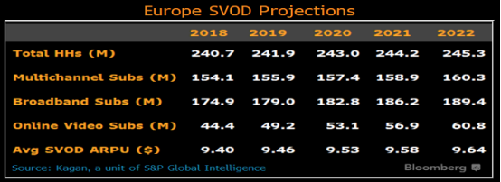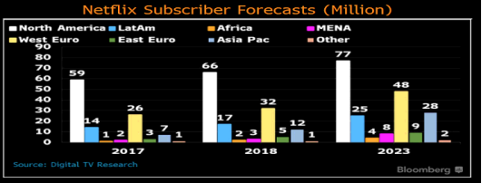 奈飞第一个进入的海外市场:西欧,一直是奈飞在欧洲成功的推动力之一。西欧和东欧加起来目前有1亿7500万的宽带用户,预计在2022年这个数字将达到1亿8900万。目前奈飞在欧洲的的家庭占有率只有25%,这表示在奈飞在未来的欧洲市场有巨大的增长潜力。奈飞现有的客户包括英国600万、德国500万、荷兰250万、法国200万、西班牙和意大利各100万。