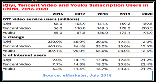 由于中国广电集团的种种规章和制度,奈飞始终没有进入中国这个世界最大的影视市场。2018年中国有2亿2900万人次使用订阅影视服务,其实60%的市场被腾讯视频、阿里的优酷和百度的爱奇艺占有。其实在这些视频门户中,原创内容和作品也成为了其主要成长的动力之一。