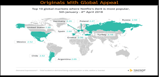 奈飞把越来越多的精力放在较大的海外市场,比如:印度、墨西哥和德国。奈飞在各个国家创作符合当地人文化和审美观点的当地原创电影系列,这样的话在一些经济欠发达地区制作成本相应的有所下降,其次由于是当地团队的拍摄,所产出的原创电影可以提供给当地订阅者高质量观影感受。奈飞这样的做法在海外取得了巨大的成功,其中比较出名的电视剧包括:巴西原创《3%》;德国原创《柏林之狗》;印度原创《选择日》;