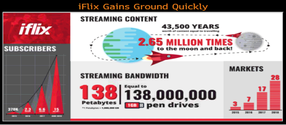 Iflix公司成立于 2015 年,总部位于吉隆坡,为超过1500万用户提供视频流媒体服务,业务范围主要覆盖东南亚市场,包括文莱、印度尼西亚、马来西亚、巴基斯坦、斯里兰卡、泰国、马尔代夫、菲律宾和越南。Iflix目前提供非常有竞争力的3-5美元每月的订阅费,其中包括广受欢迎的英格兰足球联赛。在亚洲奈飞和其他竞争者对抗面临两个较大的问题:第一就是较为昂贵的费用,第二就是订阅者必须要拥有自己的信用卡来注册。