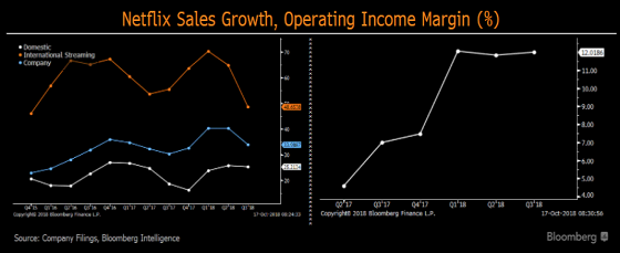 奈飞在2018年第三季度取得了700万新订阅者,该数量远远大大于的之前的预期,数据显示该订阅人数超过了奈飞的40%预计增长,这些主要归功于奈飞的原创电视剧内容。第三季度的强劲增加使得奈飞也提高了对第四季度的展望,奈飞表示在第四季度将会新增940万的新订阅者,虽说用户的订阅量不断增加,但是对于原创拍摄每一集的电视剧的成本有所上升,这样对公司的毛利率造成了一定的压力。