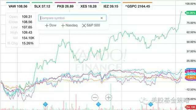图中蓝线为$(VAW)$(今年涨幅为15.26%),绿线为$(SLX)$(90.36%),红线为$(PKB)$(12.98%),紫线为$(XES)$(4.22%),浅蓝色为$(IZE)$(9.42%),橘黄色为标普500指数(5.90%)。可以看到,除了XES比标普500指数低之外,其它几支ETF走势还是强于它的。