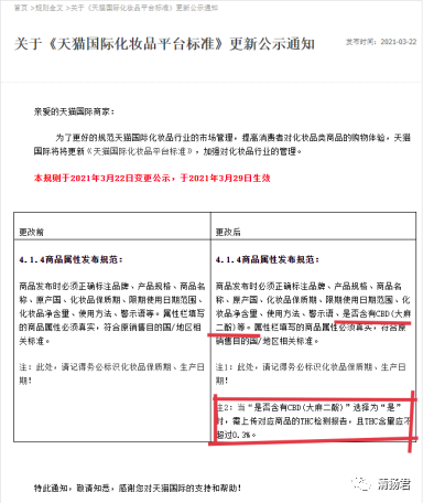 值得注意的是,更改后的《商品属性发布规范》与更改前相比,规范中多了“商品中是否含有CBD(大麻二酚)”这一条规定,且公告中明确表示:当“是否含有CBD(大麻二酚)”选择为“是”时,需上传对应商品的THC检测报告,且THC含量应不超过0.3%。(THC是四氢大麻酚的简称。也是衡量大麻性质、用途的重要依据。按照现行的法律规定,只有THC数值小于0.3%的大麻才算是工业大麻,这种大麻可以提取出CBD,对癫痫等疾病有一定的作用,同时也可以作为化妆品原料)