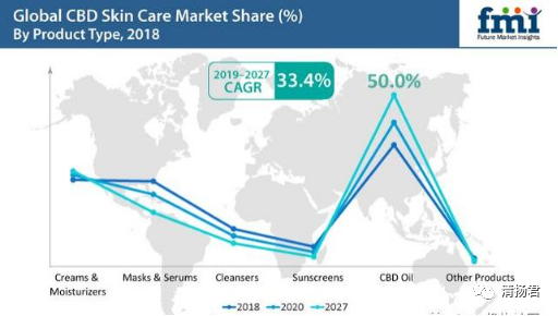 根据Future Market Insights于2019年3月19日发布的名为《CBD护肤品市场:全球行业分析和机遇评估2019-2027》的报告中显示,2017年的CBD护肤品市场为3.7亿美元,2019年CBD护肤品的销售收入将超过6.45亿美元。据预测,2019-2027年,销售额预计将以33.4%的年复合增长率不断扩大。