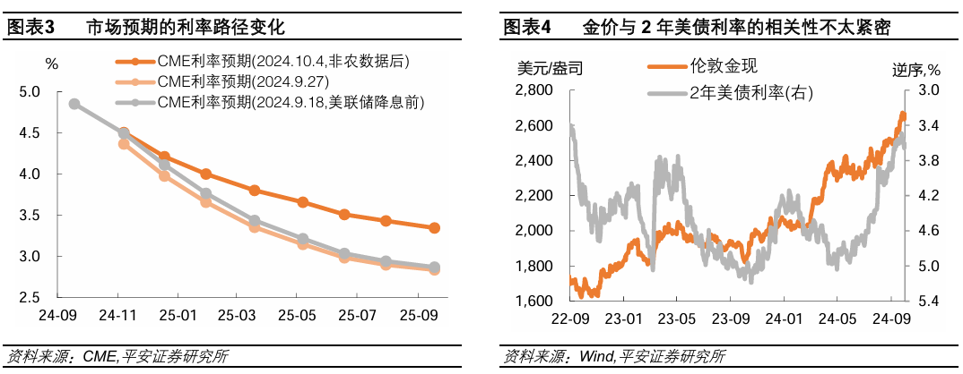 短端美债利率在美联储降息后的一周里有所下行,但对金价的提振应相对有限。本轮降息周期的特殊之处在于,美联储罕见以50BP开局,但引导市场保持美国经济“软着陆”预期。据CME FedWatch,本轮降息后,市场预期的利率路径一度下移,即预期美联储会加快降息速度,但未来一年后的预期利率水平保持在2.5-3%附近。这使得短端美债利率一度较快下行,如2年美债利率在9月18日至24日期间下降了10BP,期间金价也较快上行。但是,金价与2年美债利率的历史相关性,并不如与10年美债(实际)利率。过去二十年,金价与2年美债利率的相关系数为-0.20,金价与10年美债名义和实际利率的相关性分别为-0.54和-0.60。从这个角度看,短端利率下行对金价的提振应相对有限。更不必说,近期市场对短期利率的预期出现上修,2年期美债利率在9月25日至10月4日期间反弹了44BP,9月18日以来累计上行34BP。