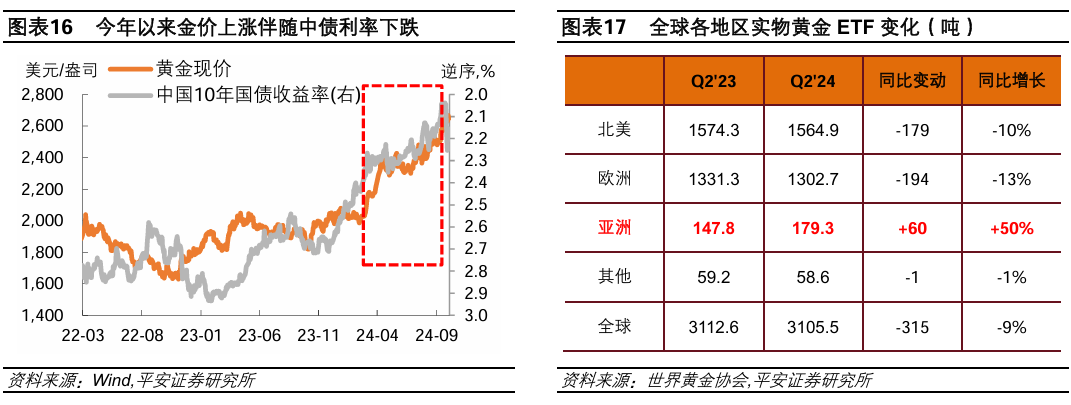 最后,伴随中国经济前景改善,亚洲资金对黄金的配置需求可能降温。近一年金价与中债利率的相关性出现上升。尤其观察到,今年3月以来,伴随10年中债利率下破2.3%关口,金价加速上涨。这背后是,中国及亚洲地区对黄金的配置需求显著增长。据世界黄金协会数据,中国大陆对黄金的“投资”需求(包括金条、金币和ETF等),由2023年二季度的49.3吨大幅增长至2024年二季度的80吨,同比涨幅高达62%,与此同时全球的“投资”需求同比仅增长1%。此外,今年二季度,亚洲地区的实物黄金ETF同比大幅增长,在全球范围内表现最优。9月24日以来,中国稳增长政策显著发力,伴随经济前景改善,此前积极配置黄金的亚洲资金有望回流中国,并可能引发金价调整。