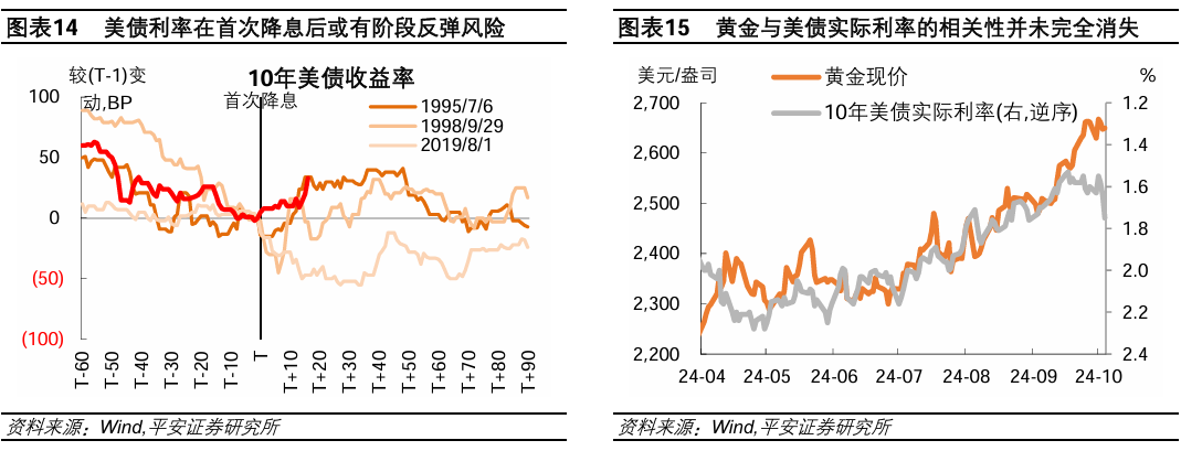 其次,美债利率近期反弹,对金价构成的压力逐渐累积。历史上,在美国经济“软着陆”情景之下,10年美债利率在首次降息后1-2个月往往出现阶段反弹。我们在报告《降息50BP的情理之中与意料之外》中指出,本轮美联储开启降息后,美国经济和通胀或存一定上行风险。截至10月1日,亚特兰大联储GDPNow模型预测,美国三季度GDP环比折年增长率为2.5%。近期由于美联储的预期引导和最新非农就业数据超预期走强,10年美债利率已经明显反弹,对金价构成的压力也在逐渐累积。尽管金价与美债(实际)利率的相关性不如从前,但并未消失。今年4月以来至9月18日美联储降息前,金价的上涨与10年美债实际利率的下行较为同步。