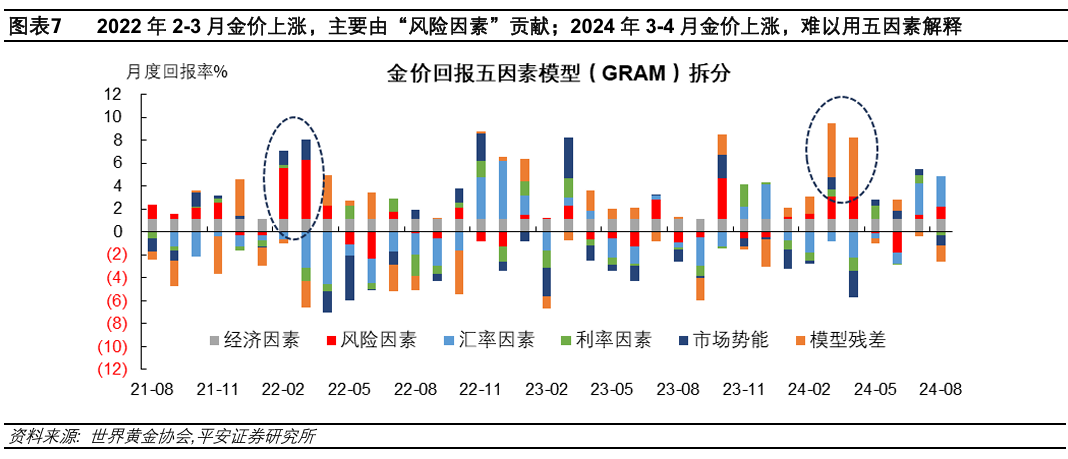 基于美元体系的传统分析框架,难以解释金价与美债相关性的退化。世界黄金协会的金价回报五因素模型(GRAM),将驱动金价的因素划分为经济、风险、汇率、利率和市场势能五大因素。在历史上多数时期,上述因素能较好地解释金价的变动。模型显示,2022年2-3月金价的上涨,主要由“风险因素”贡献;2024年3-4月金价的高额回报,则难以用五因素解释,模型残差较高,说明基于美元体系的传统分析框架暂时失灵。