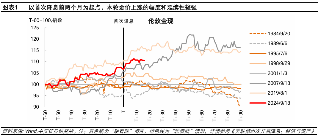 美联储降息通常有利于金价上涨,但考虑到本轮金价在降息前已经明显走强,降息后的强劲表现仍超预期。过去7轮降息周期的经验是,金价在美联储首次降息前较有可能上涨,因市场降息预期先行,但降息开启后较有可能出现波动横盘(参考报告《美联储历次开启降息:经济与资产》)。对比来看,以首次降息前两个月为起点,伦敦黄金现价已累计上涨超10%,本轮金价上涨的幅度和延续性较强,仅次于2019年。