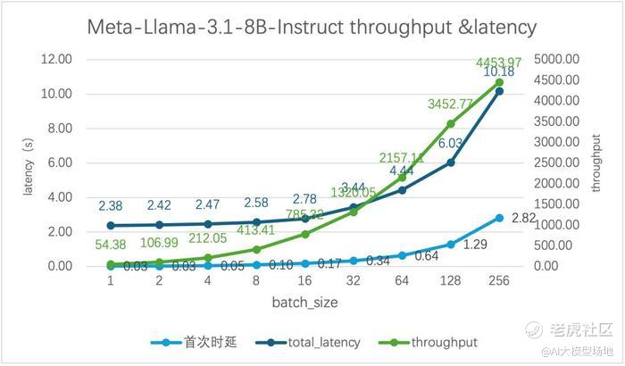 首先我们测试了Llama3.1 8B,在测试batch size达到256情况下,吞叶率最高可达约4454 token/s,同时,总时延控制在合理的10秒左右,首字时延2.8秒左右。