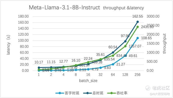 在此测试用例中,首先测试了llama 3.1 8B-Instruct,我们可以将batch size 控制在16-32之间,其首字时延在4-9秒之间,吞吐率可在400-635 token/s。