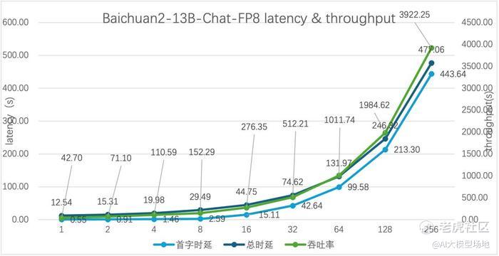 为了对比,这次对Baichuan2-13B进行了FP8的量化,其表现如下图:在测试batch size 达到256的情况下,吞叶率最高可达2137 token/s,首字时延为2.48秒。