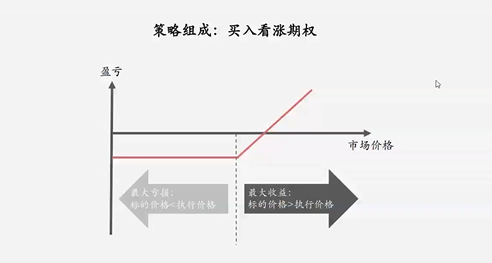 这是最基本的一个策略,买看涨期权,应用场景就是对厚实看大涨,而对应的,这种策略的优点和缺点也非常清晰,优点是上涨越多获利越大 (投资者获得标的上涨部分的收益,减去期权成本),亏损有限,亏损金额为期权费,无需缴纳保证金。缺点是期初需要支付期权费用。